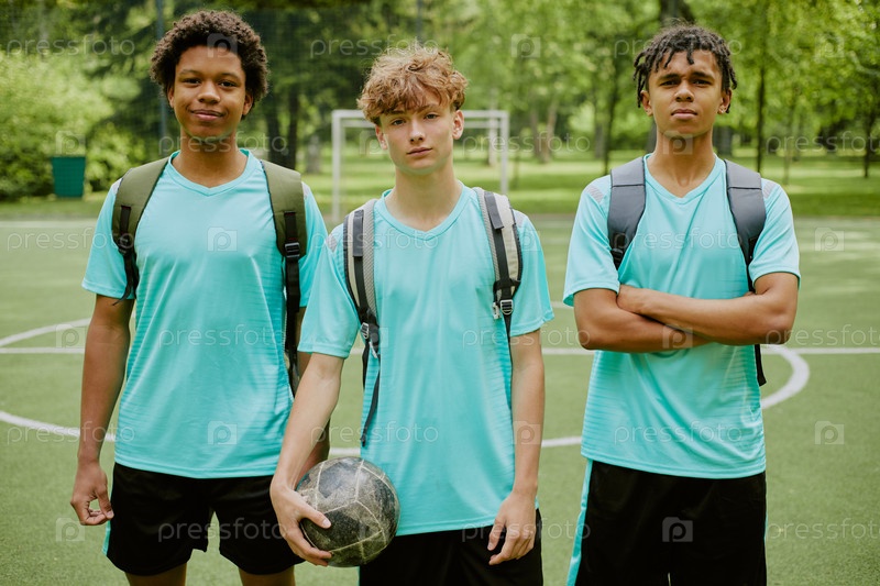 Портрет трех мальчиков-подростков, стоящих на футбольном поле в рюкзаках