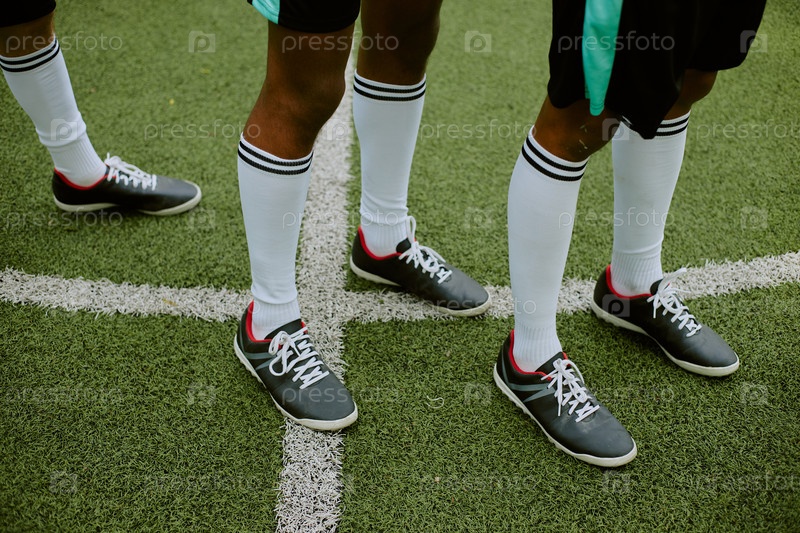 Подростки, стоящие на футбольном поле в спортивной обуви