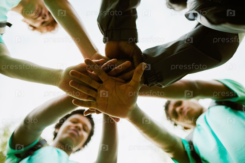 Различные подростки складывают руки в командной работе, жест на открытом воздухе