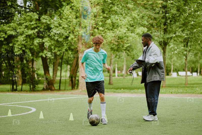 Мальчик-подросток практикует футбольные тренировки с чернокожим мужским тренером на открытом воздухе