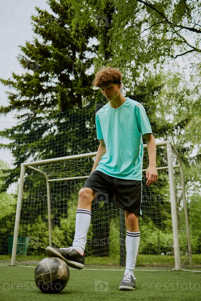 Подросток контролирует футбольный мяч на открытом поле во время тренировки