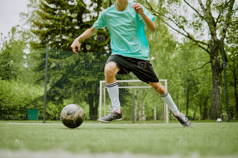 Подросток дриблирует футбольный мяч на открытом поле во время игры