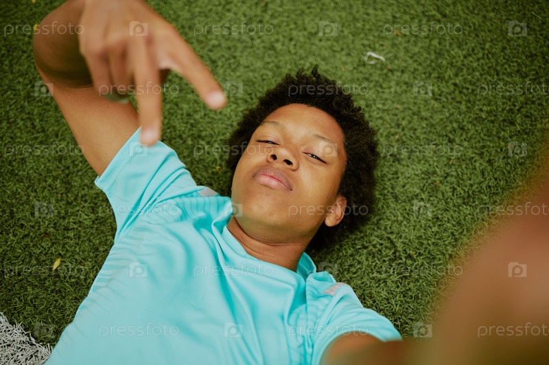 Портрет чернокожего мальчика-подростка, лежащего на траве и делающего мирный знак