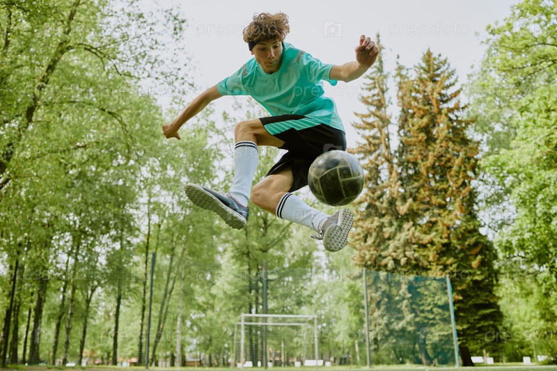 Мальчик-подросток бьет футбольный мяч, прыгая на открытом воздухе в парке