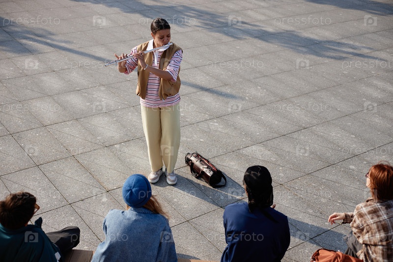 Молодая женщина играет на флейте на открытом воздухе, развлекая разнообразную аудиторию