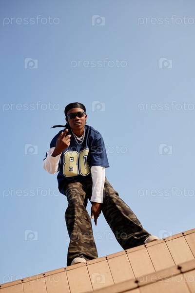 Молодой взрослый чернокожий мужчина стоит на крыше и жестикулирует к камере