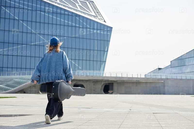 Молодая взрослая женщина ходит на улице, неся чехол для музыкальных инструментов