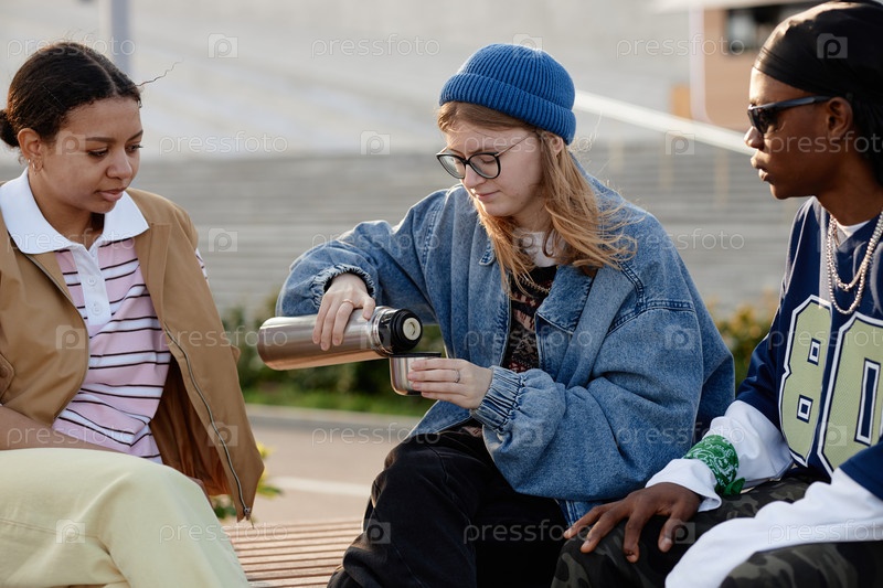 Мультиэтнические молодые взрослые сидят на улице, делясь горячим напитком вместе