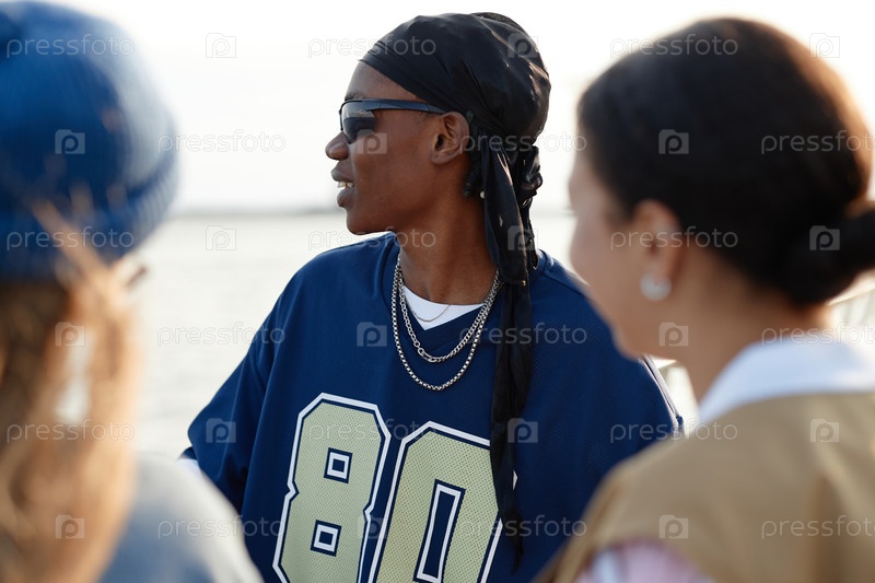 Молодой взрослый чернокожий мужчина в солнцезащитных очках общается на свежем воздухе с друзьями