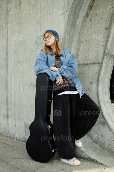 Молодая женщина, опирающаяся на гитарный корпус и стоящая против бетонной стены