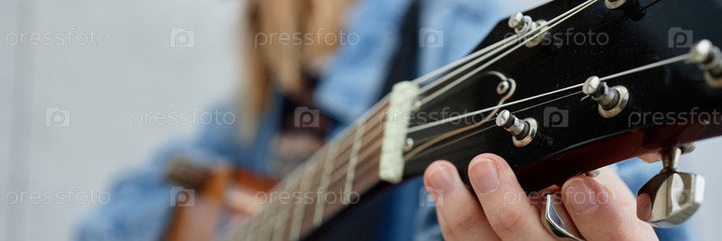 Заголовок с девушкой, играющей на акустической гитаре во время музыкальной практики