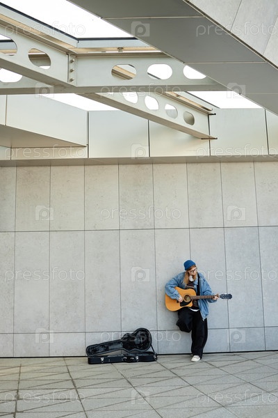 Молодая взрослая женщина играет на акустической гитаре на открытом воздухе возле современной стены