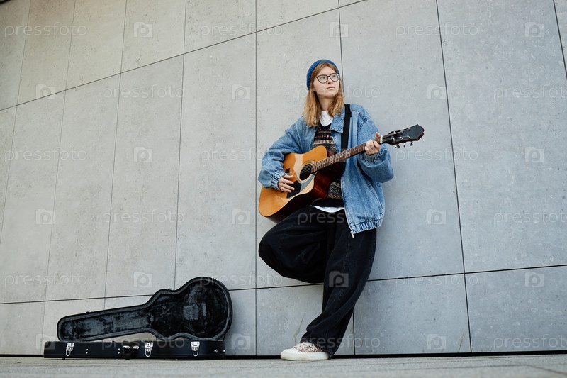 Молодая взрослая женщина играет на акустической гитаре, стоя против стены