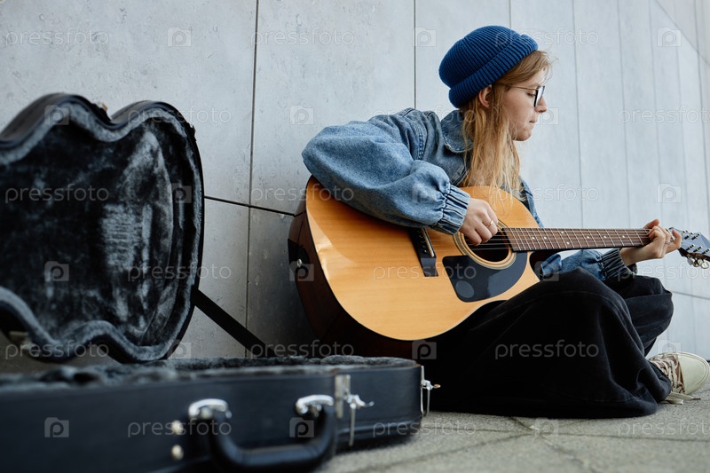 Молодая взрослая женщина играет на акустической гитаре На улице возле стены