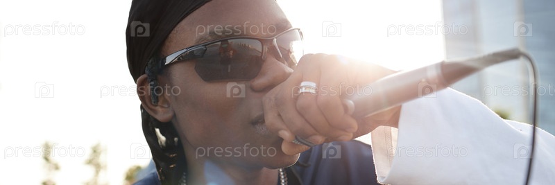 Header of Черный мужчина исполняет рэп-музыку на открытом воздухе, нося солнцезащитные очки