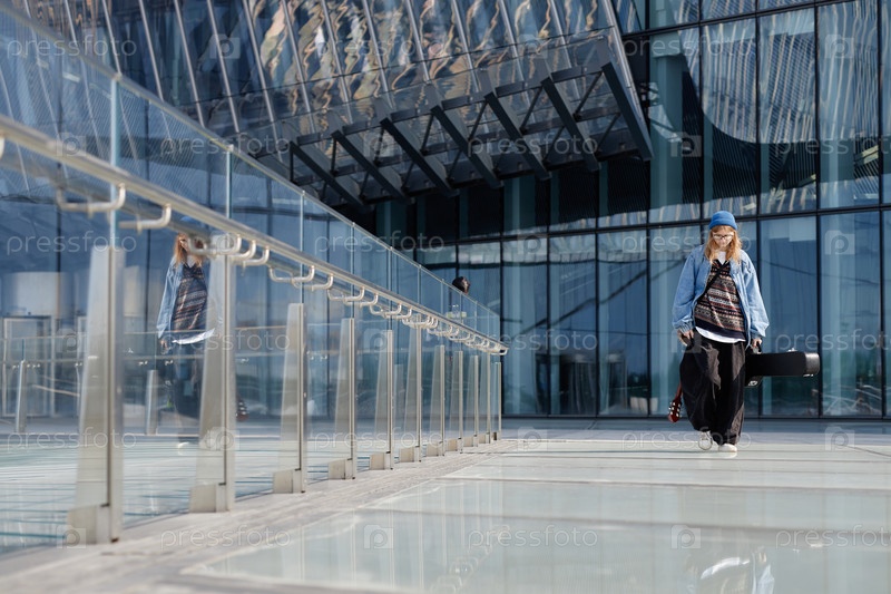 Молодая женщина гуляет на открытом воздухе, неся гитарный чехол возле современного здания