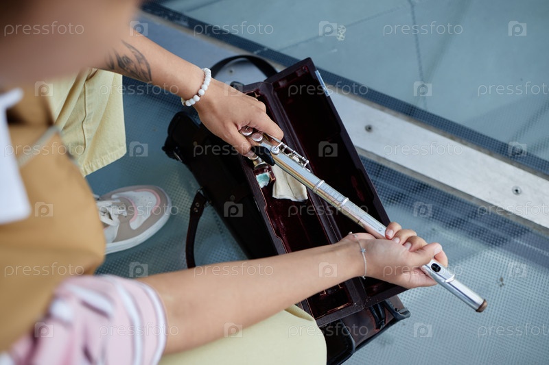 Молодая взрослая женщина собирает флейту, сидя на стеклянном полу в помещении