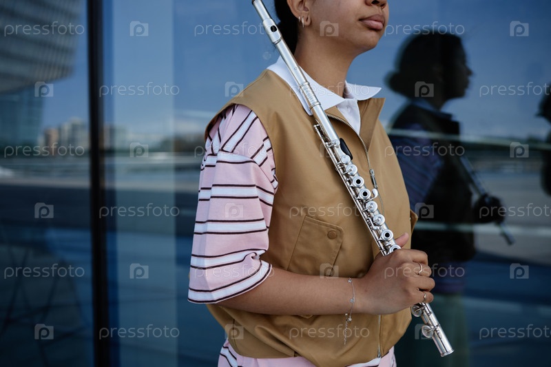 Молодая взрослая женщина держит флейту, стоя на открытом воздухе возле стеклянной стены