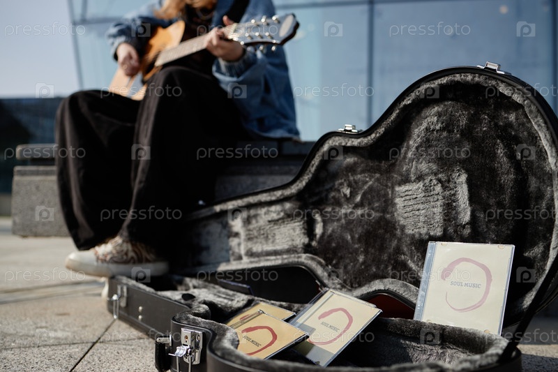 Молодая взрослая женщина играет на гитаре на открытом воздухе с дисками соль-музыки