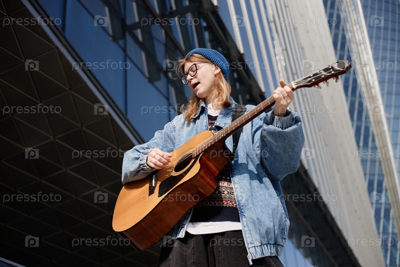 Молодая женщина играет на акустической гитаре На улице возле современного здания