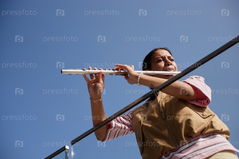 Молодая взрослая женщина играет на флейте на открытом воздухе против ясного голубого неба