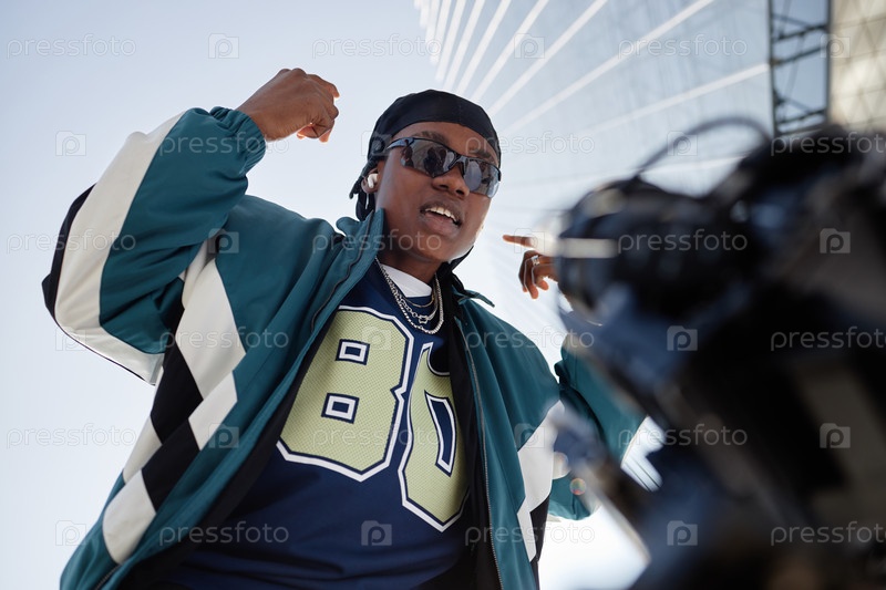 Молодой взрослый черный мужчина уверенно жестикулирует на открытом воздухе возле современного здания
