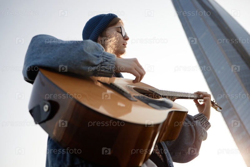 Молодая женщина играет на акустической гитаре На улице возле современного небоскреба