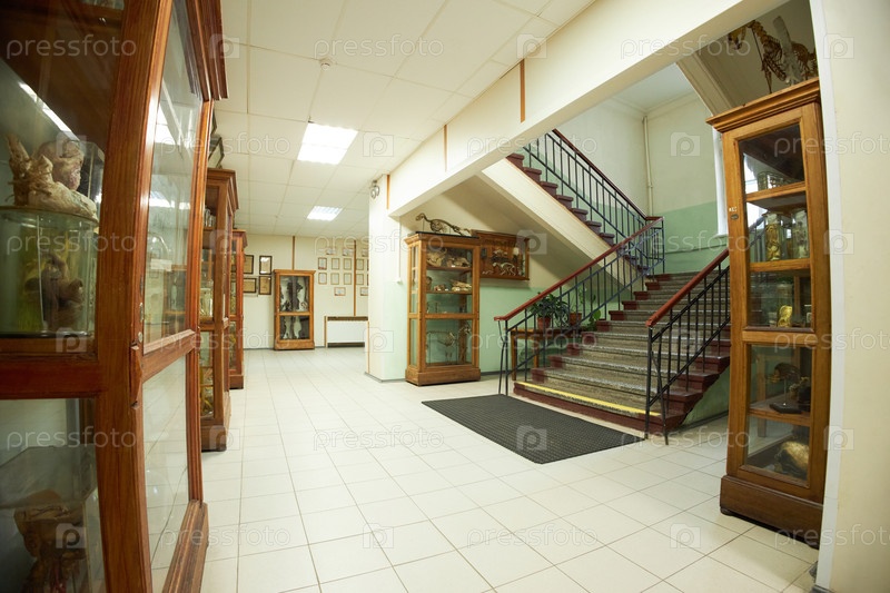 Пустой коридор музея демонстрирует образцы животных в стеклянных шкафах