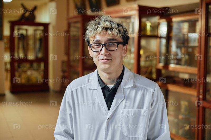 Портрет молодого взрослого мужчины с очками, улыбающегося в лаборатории