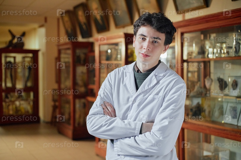 Портрет молодого взрослого мужчины в лабораторном пальто, стоящего в музее