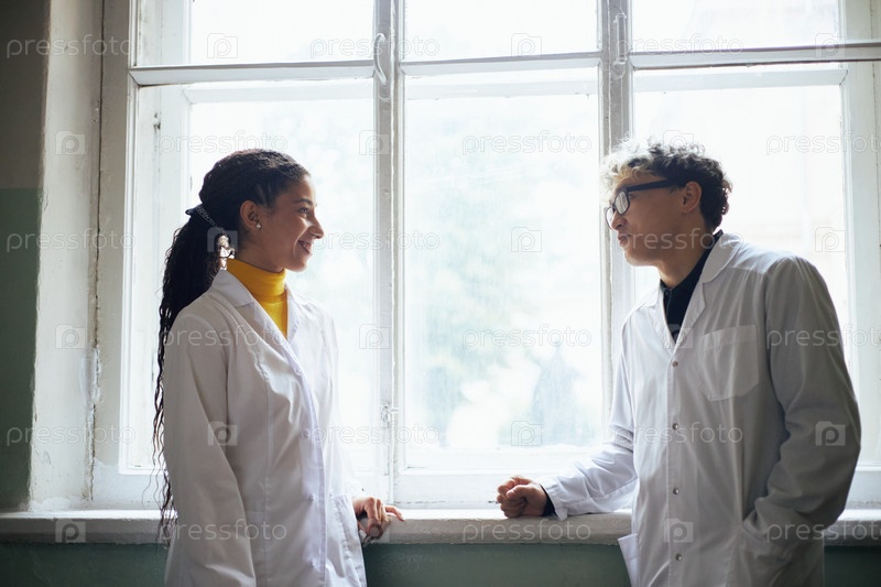 Молодые взрослые мультиэтнические ученые, носящие лабораторные пальто, ведут разговор в помещении