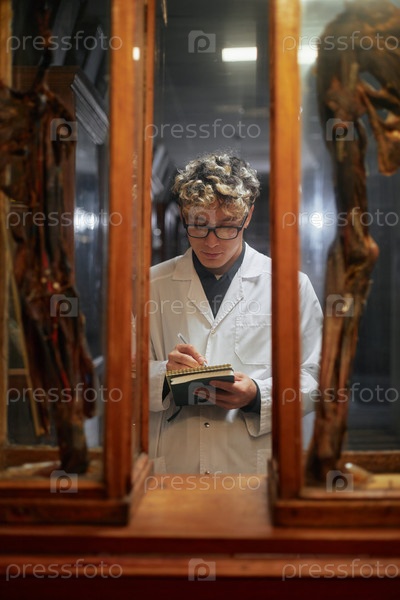 Молодой взрослый мужчина, носящий очки и делающий заметки в Научном музее