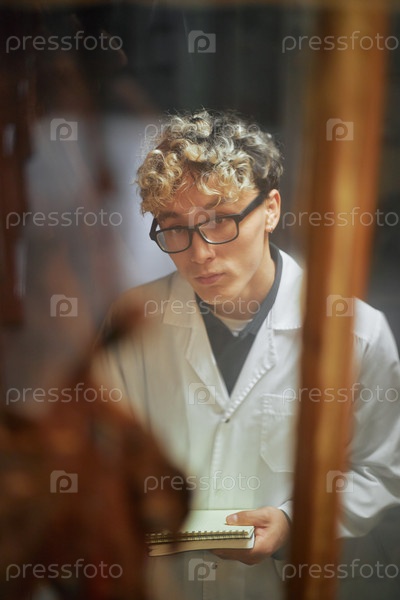 Портрет молодого взрослого мужчины с очками, наблюдающего за образцом