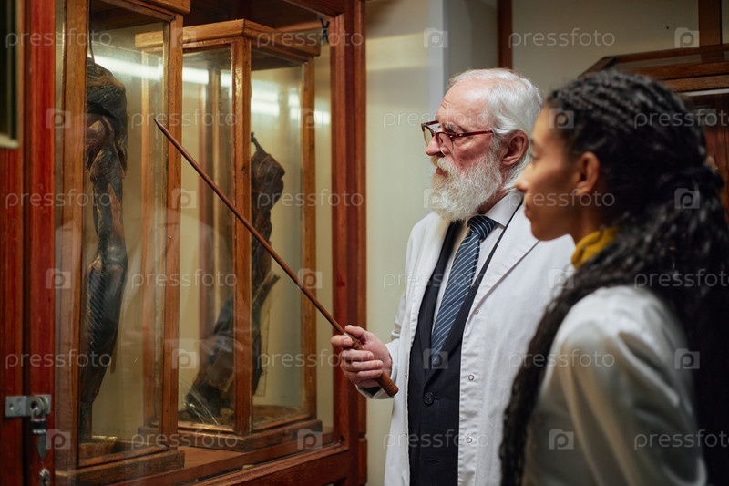 Старший мужчина объясняет анатомическую экспозицию молодой женщине