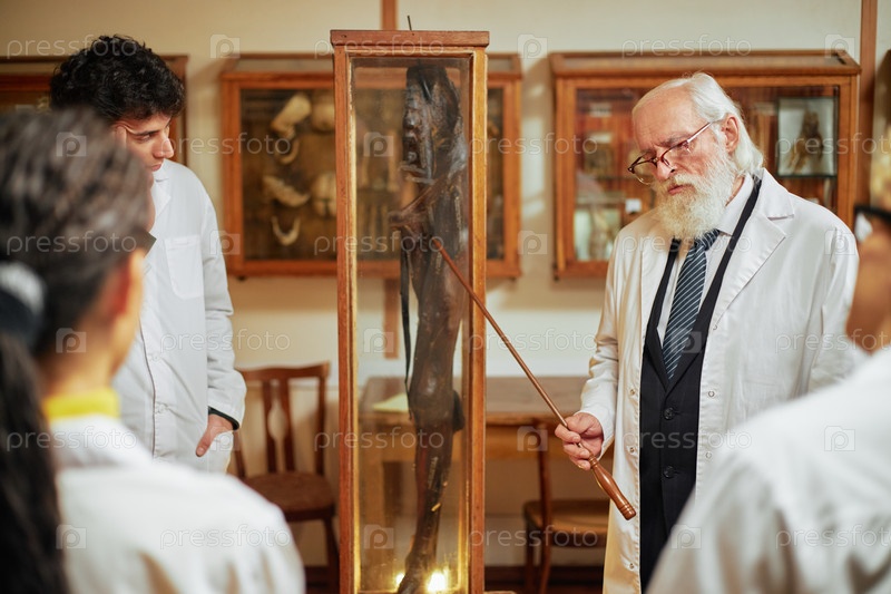 Мужчина объясняет сохранившийся образец молодым студентам старших классов