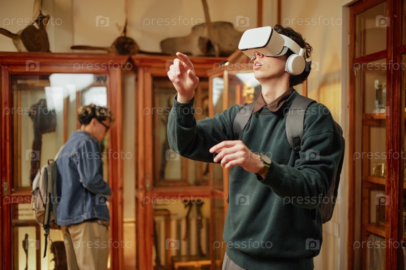 Молодой человек испытывает виртуальную реальность в музейном выставочном пространстве