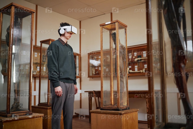 Молодой взрослый человек использует гарнитуру виртуальной реальности в научной выставке