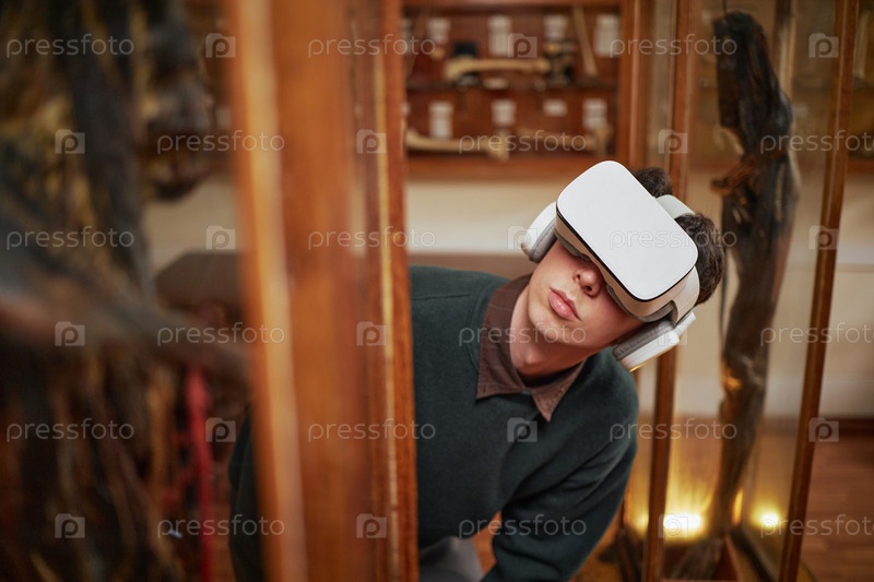 Молодой взрослый человек погружается в опыт виртуальной реальности в музее