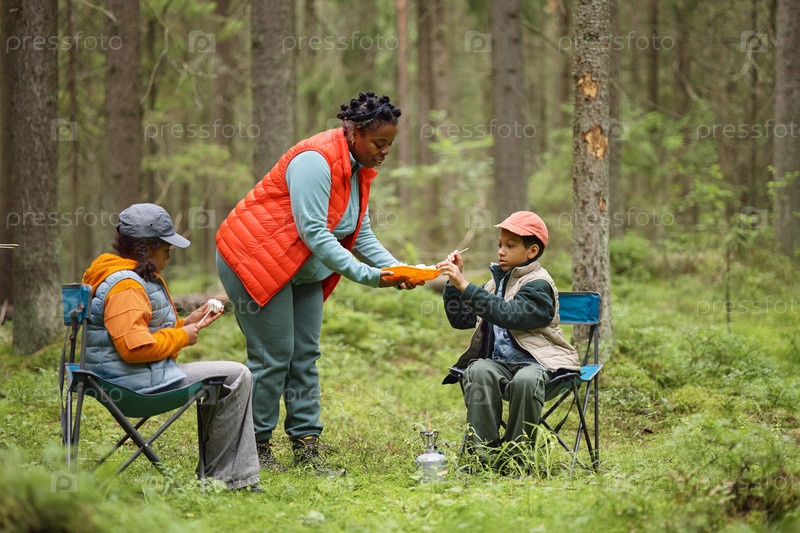 Чернокожая женщина средних лет подает еду детям во время лесного кемпинга