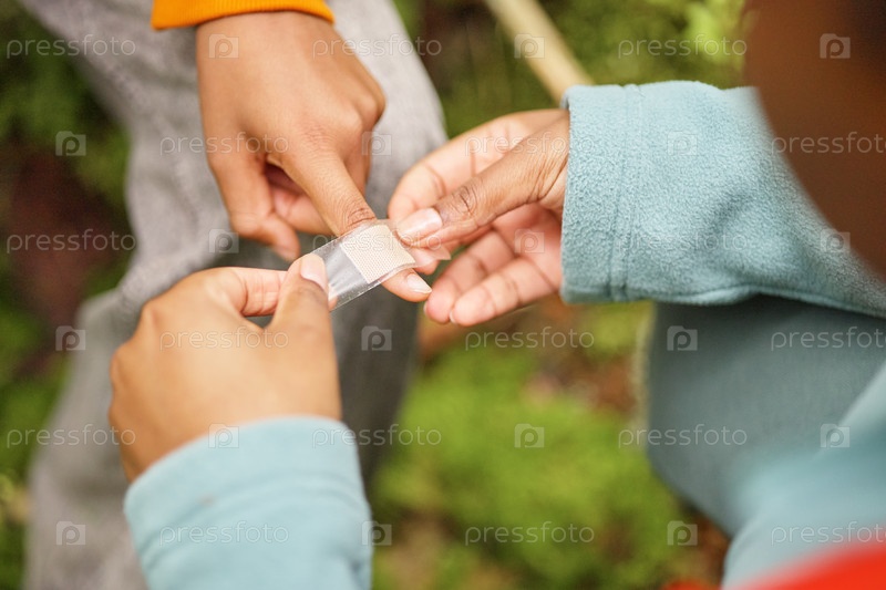 Молодая черная девушка наносит клейкую повязку на палец молодого чёрного мальчика на открытом воздухе