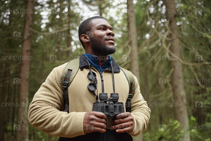 Молодой взрослый чернокожий мужчина исследует лес, держа бинокль и улыбаясь