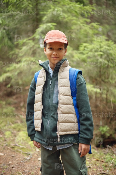 Портрет молодого чернокожего мальчика, улыбающегося на улице во время прогулки по лесу
