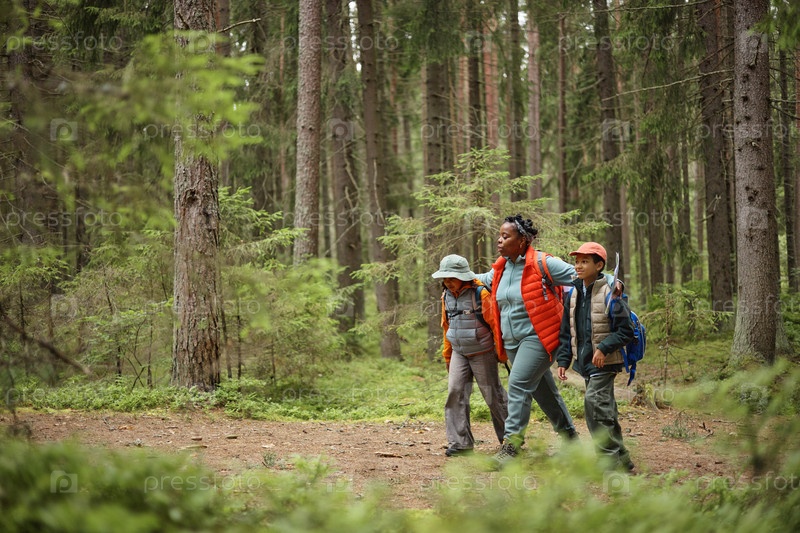 Чернокожая женщина средних лет ходит с двумя детьми в лесной среде