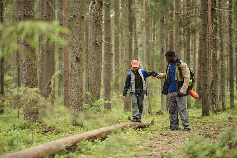 Мальчик и чернокожий человек вместе ходят в лес и балансируют на бревне