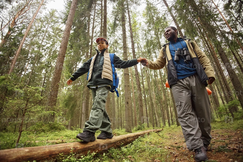 Чёрный мужчина направляет молодого мальчика, балансирующего на бревне во время прогулки по лесу