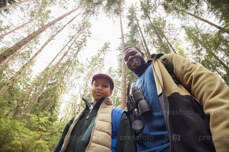 Портрет чернокожего мужчины и юного мальчика, исследующего лес во время похода