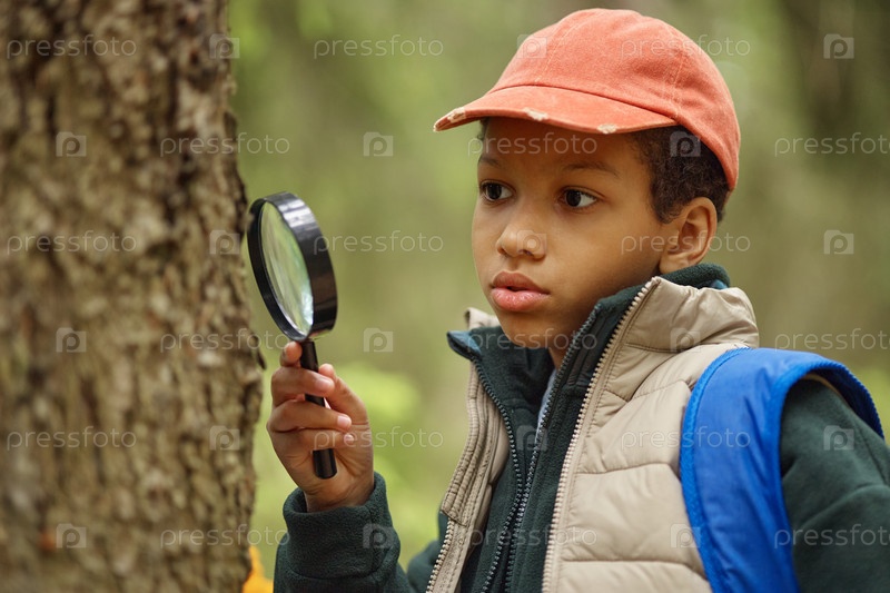 Любопытный чернокожий мальчик изучает кору деревьев с помощью увеличительного стекла на открытом воздухе