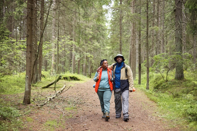 Черная пара средних лет вместе гуляют по лесной тропе, наслаждаясь природой