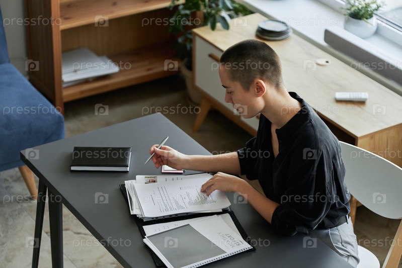 Молодой специалист по персоналу с короткими волосами сидит за столом в современном офисе, сортируя документы для резюме