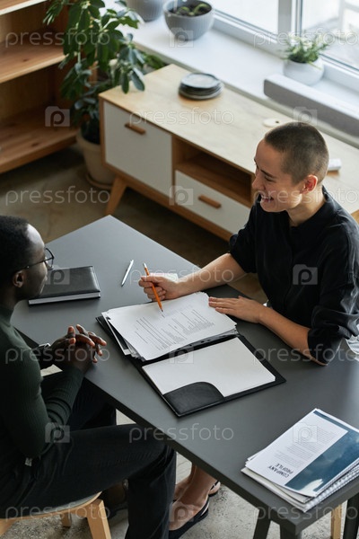 Молодая женщина сидит за столом в офисе и ведет разговор с афроамериканским соискателем работы